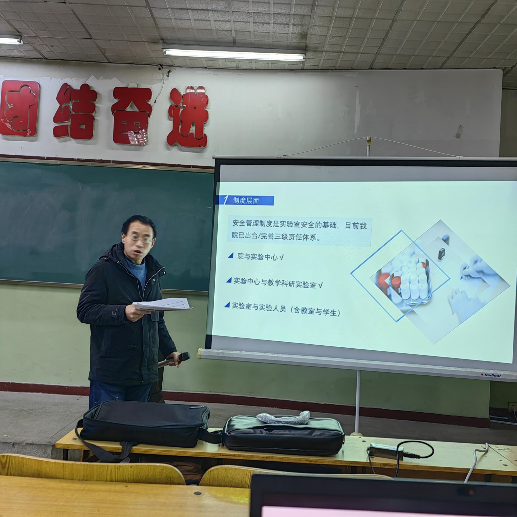 随后,学院实验中心主任李秉正老师为大家进行了实验室安全培训。他介绍了实验室安全制度和操作规程,针对目前我院教学及科研实验室存在的问题再次强调牢固树立安全意识,落实安全责任。
