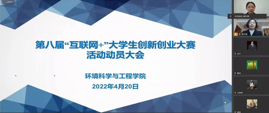 会上,学院副院长郭少青老师为大家介绍了互联网+大学生创新创业大赛相关专业知识,环保设备工程192301班刘雨辰同学为互联网+大学生创新创业大赛作了经验分享。